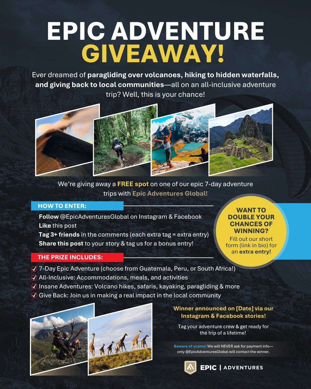 By submitting this form, you consent to receive event notifications from Epic Global Adventures via SMS messaging. Message frequency may vary weekly. Reply "STOP" to unsubscribe. Text HELP for assistance. Standard message and data rates may apply. Your information will be handled in accordance with our Privacy Policy.